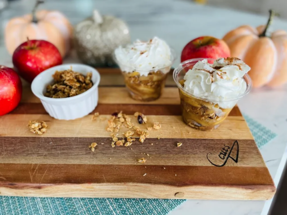 - Begin layering the cups: add 2 tbsp granola, 2-3 tbsp cooled cinnamon apples, a generous dollop of whipped cream